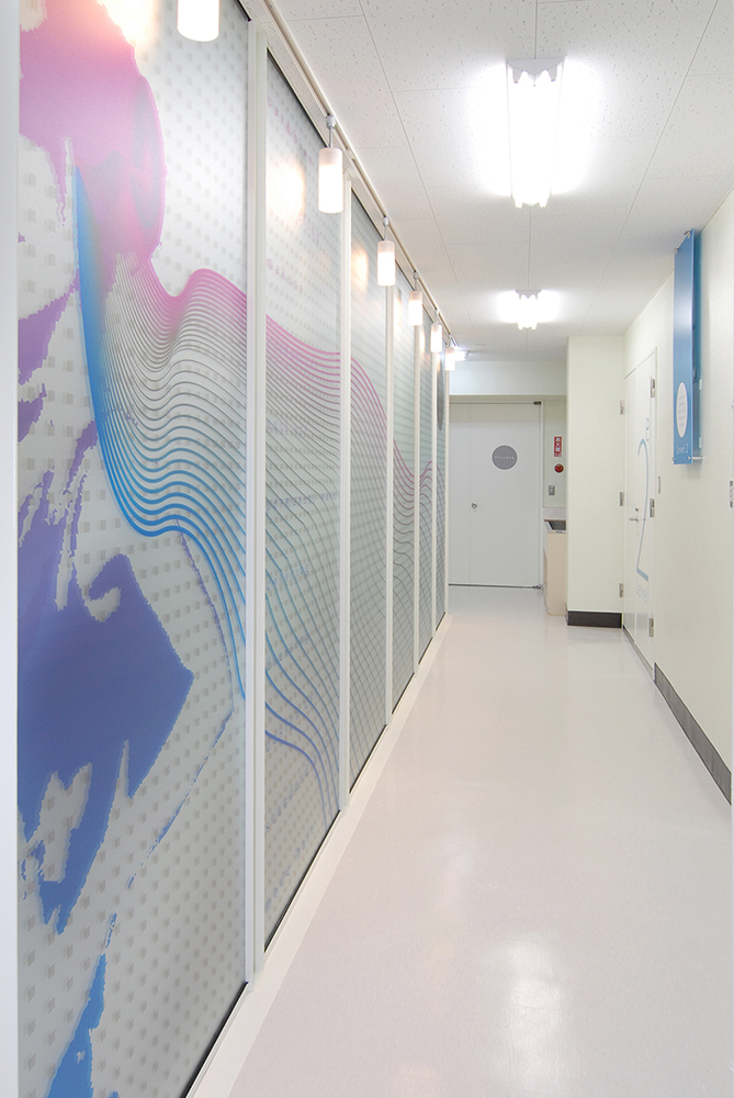 鏡台つきのデスクが並ぶメイク実習室は、発色を確認しやすい白が基調の明るい空間。